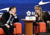 Российский космический форум, приуроченный к 65-й годовщине полета космонавта Юрия Гагарина, в Национальном центре "Россия". Председатель ПАО "Промсвязьбанк" Петр Фрадков (слева) и первый заместитель генерального директора негосударственного института развития "Иннопрактика" Наталья Попова (справа) во время сессии "Частный космос: инвестиции и модели роста для новой экосистемы".