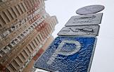 Жанровая фотография. Снегопад в городе. Занесенные снегом дорожные знаки на улице.
