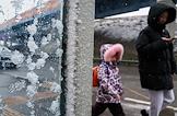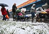 Жанровая фотография. Снегопад в городе. Женщины с детскими колясками и детьми идут по улице во время снегопада.