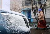 Жанровая фотография. Снегопад в городе. Припаркованный заснеженный автомобиль на улице города.
