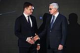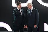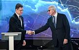 Торжественная церемония награждения победителей Национальной премии "Наш вклад" в Конгресс-парке гостиницы "Рэдиссон Ройал Москва". Заместитель председателя правительства России Александр Новак (слева) и президент Российского союза промышленников и предпринимателей (РСПП) Александр Шохин (справа) на церемонии.