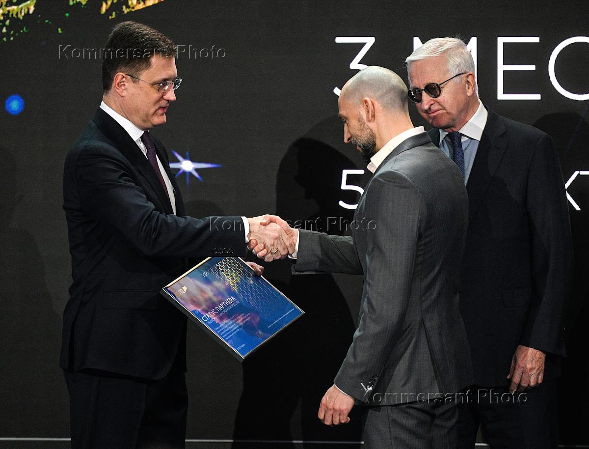 Торжественная церемония награждения победителей Национальной премии "Наш вклад" в Конгресс-парке гостиницы "Рэдиссон Ройал Москва". Заместитель председателя правительства России Александр Новак (слева) на церемонии.