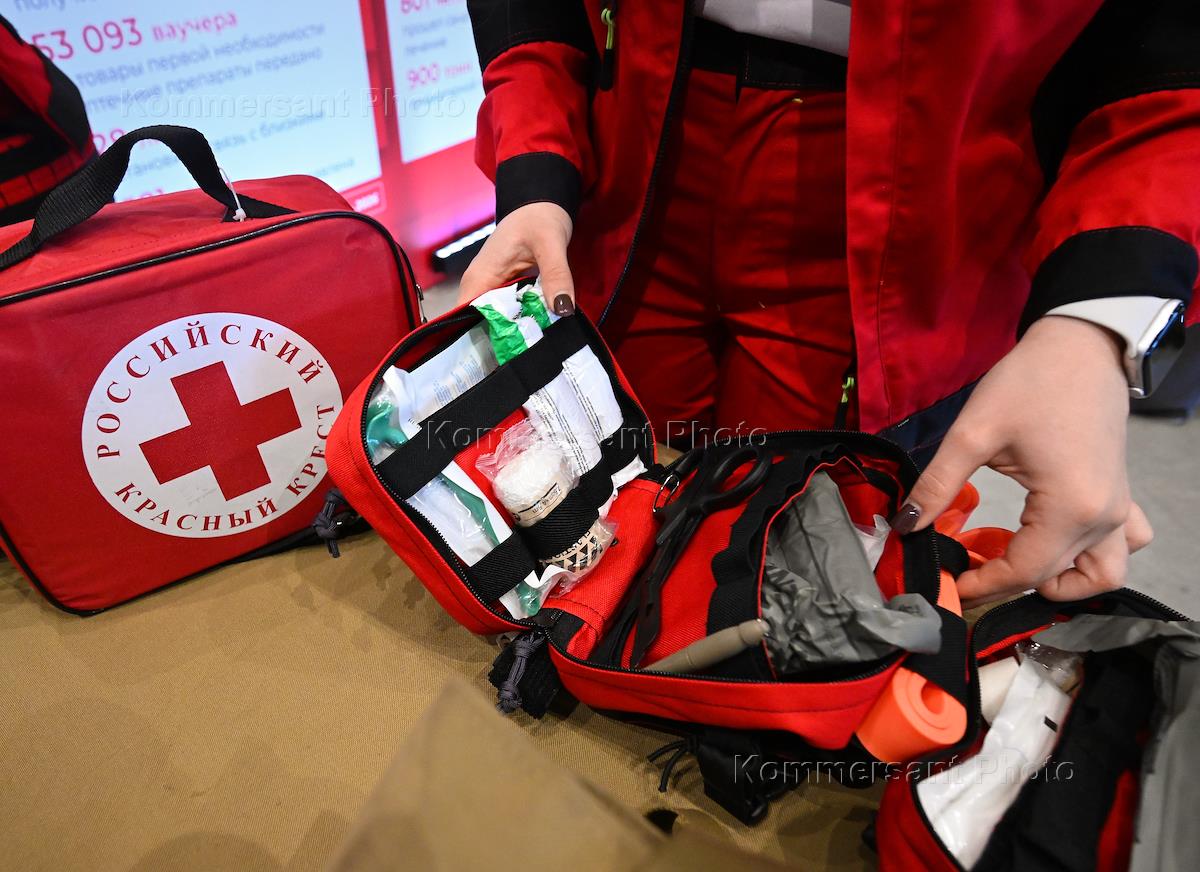 XVIII съезд Российского Красного Креста (РКК) на ВДНХ. Выставка на съезде. Аптечка сотрудника РКК на выставке.