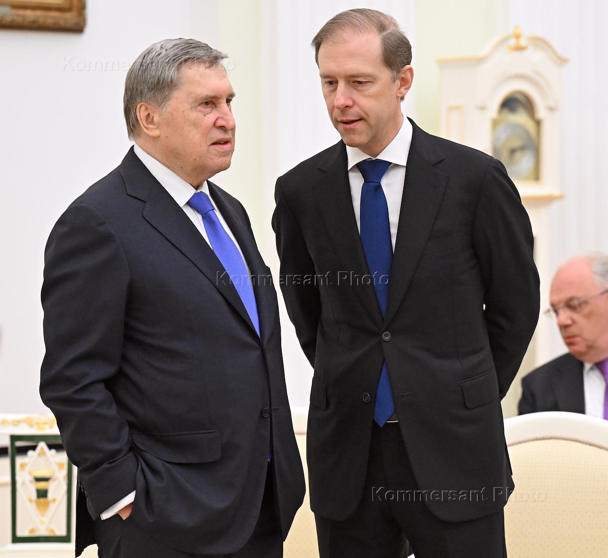 Встреча президента России Владимира Путина и президента Индонезии Прабово Субианто в Кремле. Первый заместитель председателя правительства России Денис Мантуров (справа) и помощник президента России Юрий Ушаков (слева) перед началом встречи.