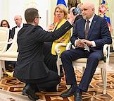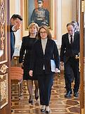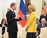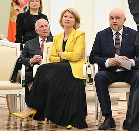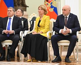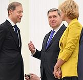 Встреча президента России Владимира Путина и президента Индонезии Прабово Субианто в Кремле. Справа налево: министр энергетики России Сергей Цивилев, министр сельского хозяйства России Оксана Лут и генеральный директор Государственной корпорации по содействию разработке, производству и экспорту высокотехнологичной промышленной продукции "Ростех" Сергей Чемезов перед началом встречи.