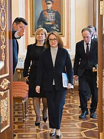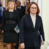 Встреча президента России Владимира Путина и президента Индонезии Прабово Субианто в Кремле. Председатель Центрального Банка России Эльвира Набиуллина (в центре) перед началом встречи.