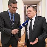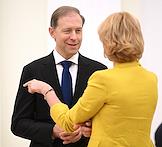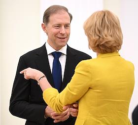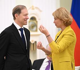 Встреча президента России Владимира Путина и президента Индонезии Прабово Субианто в Кремле. Министр сельского хозяйства России Оксана Лут (справа) и первый заместитель председателя правительства России Денис Мантуров (слева) перед началом встречи.