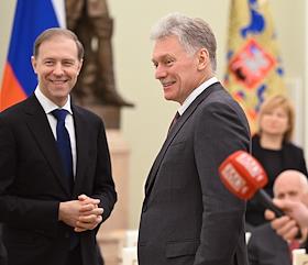 Встреча президента России Владимира Путина и президента Индонезии Прабово Субианто в Кремле. Заместитель руководителя администрации президента России, пресс-секретарь президента России Дмитрий Песков (справа) и первый заместитель председателя правительства России Денис Мантуров (слева) перед началом встречи.