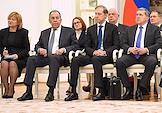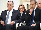 Встреча президента России Владимира Путина и президента Индонезии Прабово Субианто в Кремле. Слева направо: министр иностранных дел России Сергей Лавров, председатель Центрального Банка России Эльвира Набиуллина, первый заместитель председателя правительства России Денис Мантуров и директор Федеральной службы по военно-техническому сотрудничеству (ВТС) Дмитрий Шугаев во время встречи.