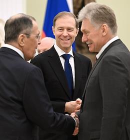Встреча президента России Владимира Путина и президента Индонезии Прабово Субианто в Кремле. Слева направо: министр иностранных дел России Сергей Лавров, первый заместитель председателя правительства России Денис Мантуров и заместитель руководителя администрации президента России, пресс-секретарь президента России Дмитрий Песков перед началом встречи.