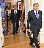 Встреча президента России Владимира Путина и президента Индонезии Прабово Субианто в Кремле. Первый заместитель председателя правительства России Денис Мантуров (справа) и помощник президента России Юрий Ушаков (слева) перед началом встречи.