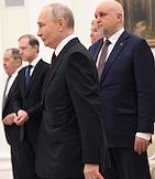 Встреча президента России Владимира Путина и президента Индонезии Прабово Субианто в Кремле. Слева направо: первый заместитель председателя правительства России Денис Мантуров, помощник президента России Юрий Ушаков и министр сельского хозяйства России Оксана Лут перед началом встречи.