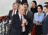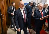 Пленарное заседание Государственной думы (ГД) России. Первый заместитель председателя комитета ГД России по информационной политике, информационным технологиям и связи Александр Ющенко (слева) и лидер КПРФ, руководитель фракции КПРФ в ГД России Геннадий Зюганов (второй слева) перед началом заседания.