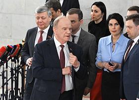 Пленарное заседание Государственной думы (ГД) России. Слева направо: член комитета ГД России по государственному строительству и законодательству Дмитрий Новиков, лидер КПРФ, руководитель фракции КПРФ в ГД России Геннадий Зюганов, первый заместитель комитета ГД России по безопасности и противодействию коррупции Юрий Афонин, член комитета ГД России по делам национальностей Анастасия Удальцова, член ГД России по аграрным вопросам Мария Прусакова и заместитель председателя комитета ГД России по контролю Георгий Камнев перед началом заседания.