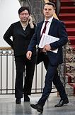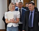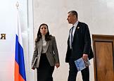 Пленарное заседание Государственной думы (ГД) России. Член комитета ГД России по труду, социальной политике и делам ветеранов Екатерина Стенякина (слева) и член комитета ГД России по бюджету и налогам Айрат Фаррахов (справа) перед началом заседания.