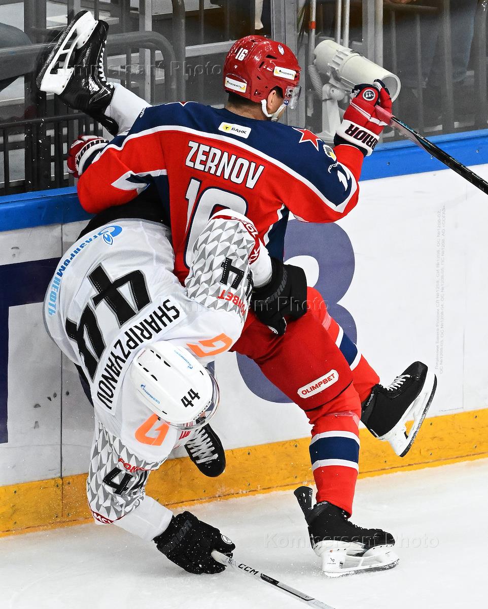 Континентальная Хоккейная Лига (КХЛ). Плей-офф 1/4 финала Кубка Гагарина. Матч между командами ЦСКА (Москва) - "Авангард" (Омск) на стадионе "ЦСКА Арена". Игрок команды "Авангард" Дамир Шарипзянов (слева) и игрок команды ЦСКА Денис Зернов (справа) во время матча.