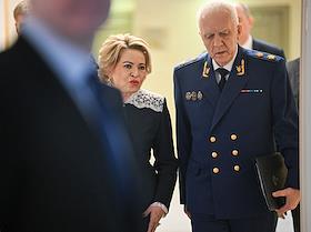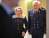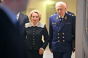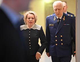 Заседание Совета Федерации (СФ) России. Председатель Совета Федерации России Валентина Матвиенко (слева) и генеральный прокурор России Александр Гуцан (справа) перед началом заседания.