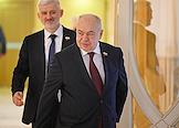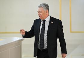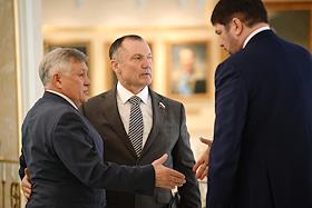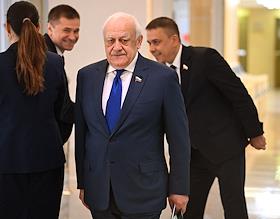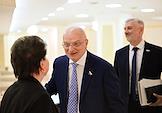 Заседание Совета Федерации (СФ) России. Представитель в СФ России от исполнительной власти Республики Северная Осетия - Алания Таймураз Мамсуров (в центре) перед началом заседания.