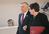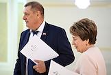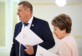 Заседание Совета Федерации (СФ) России. Представитель в СФ России от законодательного (представительного) органа государственной власти города Севастополя Екатерина Алтабаева (справа) и представитель в СФ России от исполнительного органа государственной власти Волгоградской области Николай Семисотов (слева) перед началом заседания.