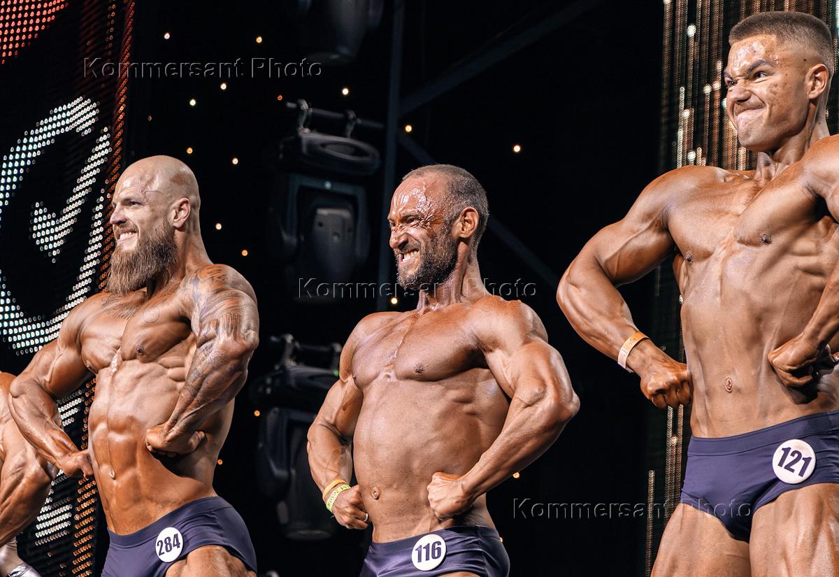 Всероссийские соревнования по бодибилдингу и фитнесу на сцене концертного зала "МТС Live Холл". Участники во время соревнований.