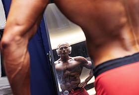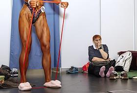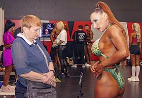 Всероссийские соревнования по бодибилдингу и фитнесу на сцене концертного зала "МТС Live Холл". Участники во время подготовки к соревнованиям.