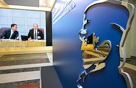 Заседание комитета по государственному строительству и законодательству в Государственной думе (ГД) России. Первый заместитель председателя комитета ГД России по государственному строительству и законодательству Юрий Синельщиков (в центре) и член комитета ГД России по государственному строительству и законодательству Дмитрий Новиков (справа) перед началом заседания.