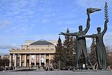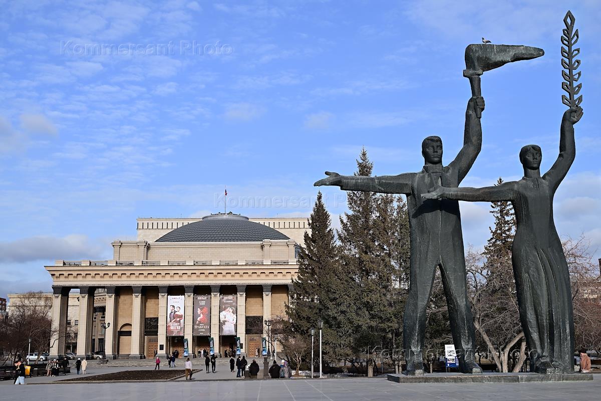Виды Новосибирска. Жанровая фотография. Фрагмент памятника вождю революции Владимиру Ленину в сквере перед зданием Новосибирского государственного академического театра оперы и балета.