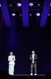 Празднование Дня рождения онлайн-кинотеатра "КИОН" в Театре на Цветном. Генеральный директор KION Алексей Иванов (справа) и генеральный директор холдинга ON Медиа Софья Митрофанова (слева) на праздновании.