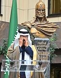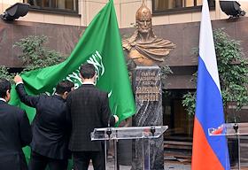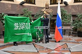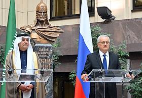 Церемония открытия выставки, посвященной 100-летию установления дипломатических отношений между Россией и Королевством Саудовская Аравия, в Министерстве иностранных дел (МИД) России. Посол Саудовской Аравии в России Сами Бен Мохаммед Аль-Садхан (справа) и заместитель министра иностранных дел России Георгий Борисенко (в центре) на церемонии.