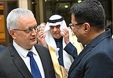Церемония открытия выставки, посвященной 100-летию установления дипломатических отношений между Россией и Королевством Саудовская Аравия, в Министерстве иностранных дел (МИД) России. Посол Саудовской Аравии в России Сами Бен Мохаммед Аль-Садхан (слева) и заместитель министра иностранных дел России Георгий Борисенко (справа) на церемонии.