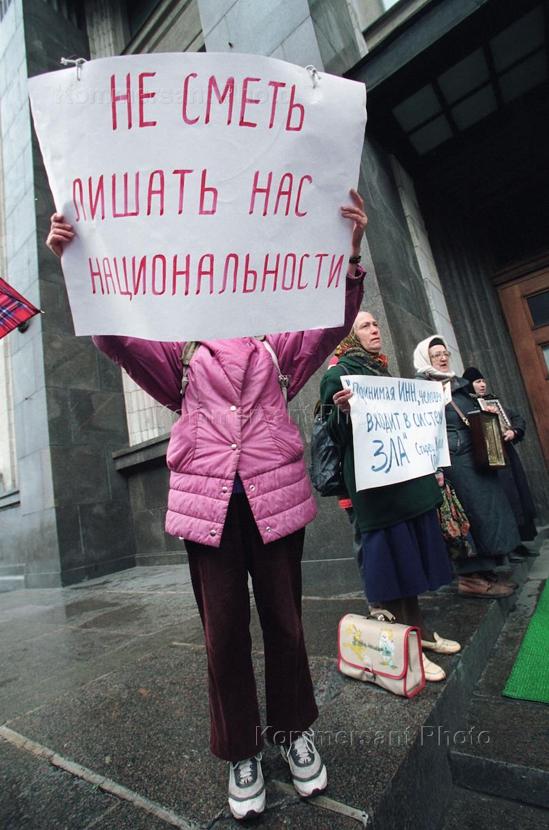 Участница пикета против глобализации мировой экономики и тотального контроля над личностью у здания Государственной Думы.
