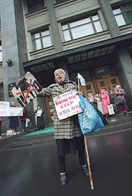 Участница пикета против глобализации мировой экономики и тотального контроля над личностью у здания Государственной Думы.
