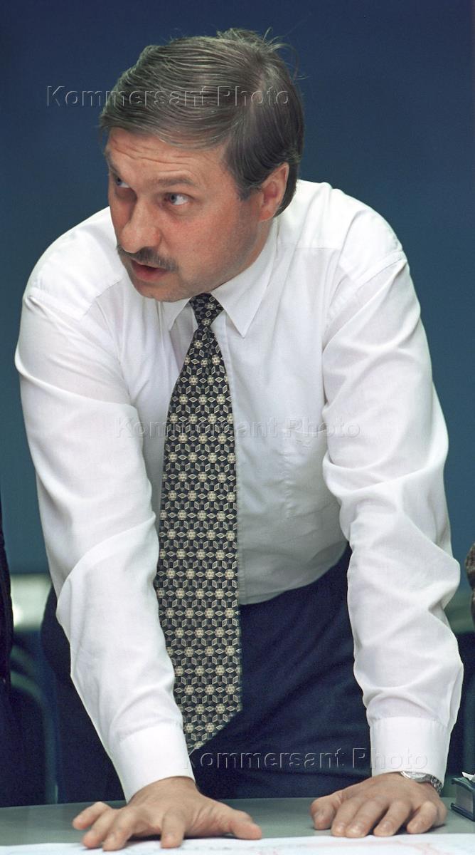 Генеральный директор международного аэропорта Домодедово Сергей Рудаков отвечает на вопросы журналистов в своем рабочем кабинете.