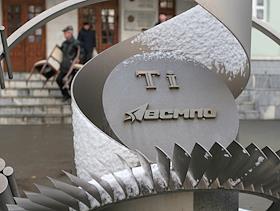 Эмблема с логотипом Верхне-Салдинского металлургического производственного объединения (ВСМПО) у заводоуправления. Мужчина выносит стулья из здания.