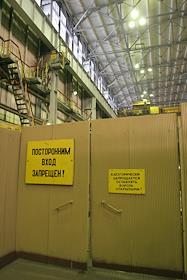 Табличка "Посторонним вход воспрещен!" на воротах в производственном цехе Верхне-Салдинского металлургического производственного объединения (ВСМПО).