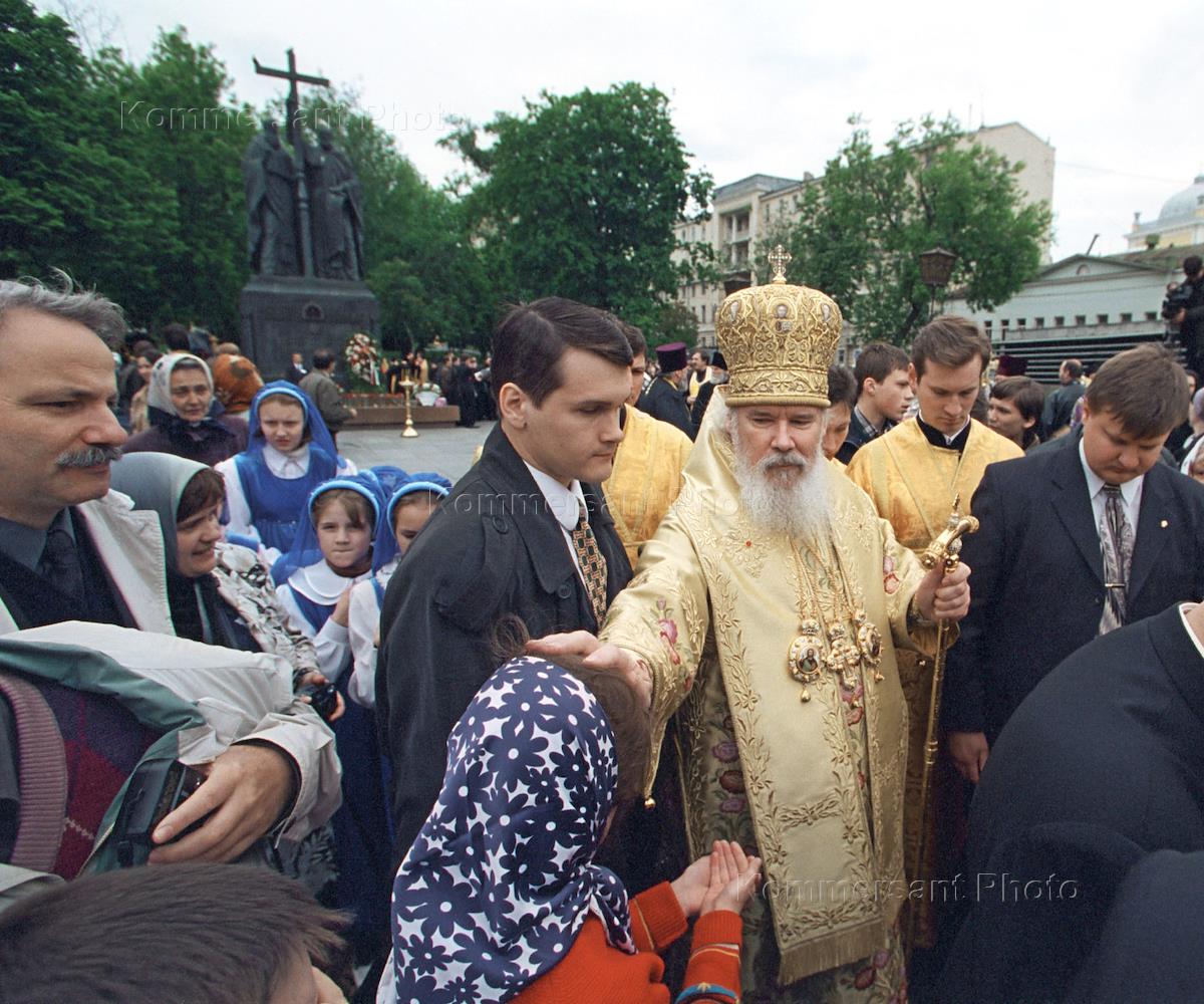 The Russian-orthodox church patriarch Alexei II celebrates a mass in front of the monument for Kirill and Mephody during the celebration of the day of Slavonic literature.