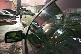 Жанровый снимок. Отражение ночного города в боковом стекле автомобиля.