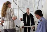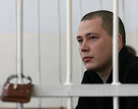 Обвиняемый по делу группировки скинхедов Антон Калинин (в центре) во время судебного процесса в Бердском городском суде Новосибирской области.