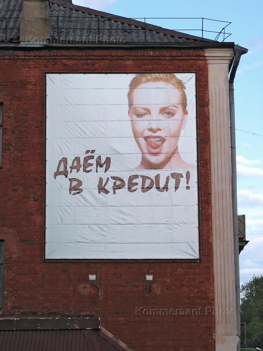 Рекламный щит с надписью "Даем в кредит" на фасаде жилого дома.
