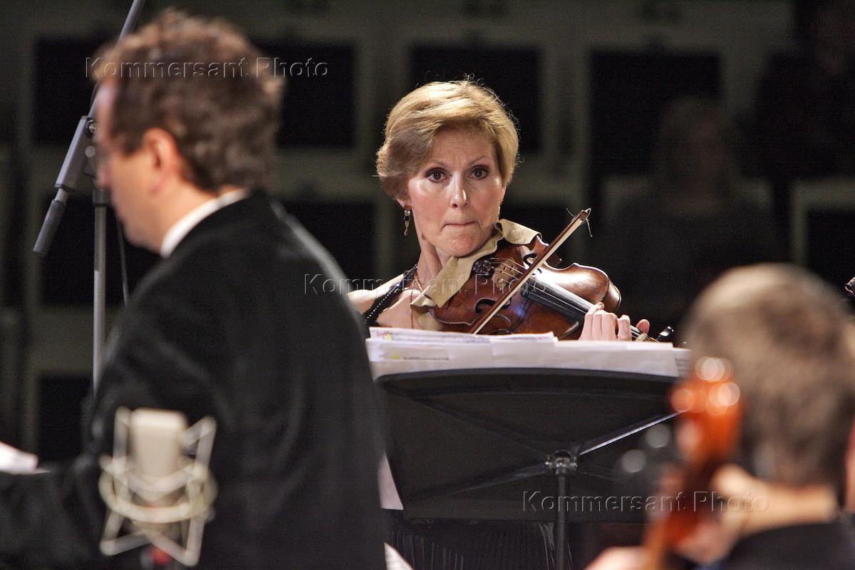 Скрипачка Татьяна Гринденко во время выступления на совместном юбилейном концерте композитора Владимира Мартынова и Татьяны Гринденко в Концертном зале имени Чайковского.