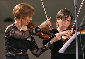 Скрипачка Татьяна Гринденко (слева) во время выступления на совместном юбилейном концерте композитора Владимира Мартынова и Татьяны Гринденко в Концертном зале имени Чайковского.