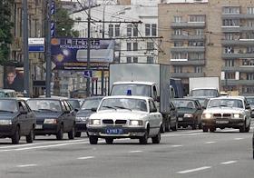 Легковой автомобиль с мигалкой на крыше среди потока машин на улице Москвы.