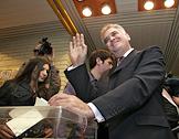 Парламентские выборы в Сербии. Заместитель председателя Сербской радикальной партии (СРП) Томислав Николич после голосования на одном из избирательных участков.