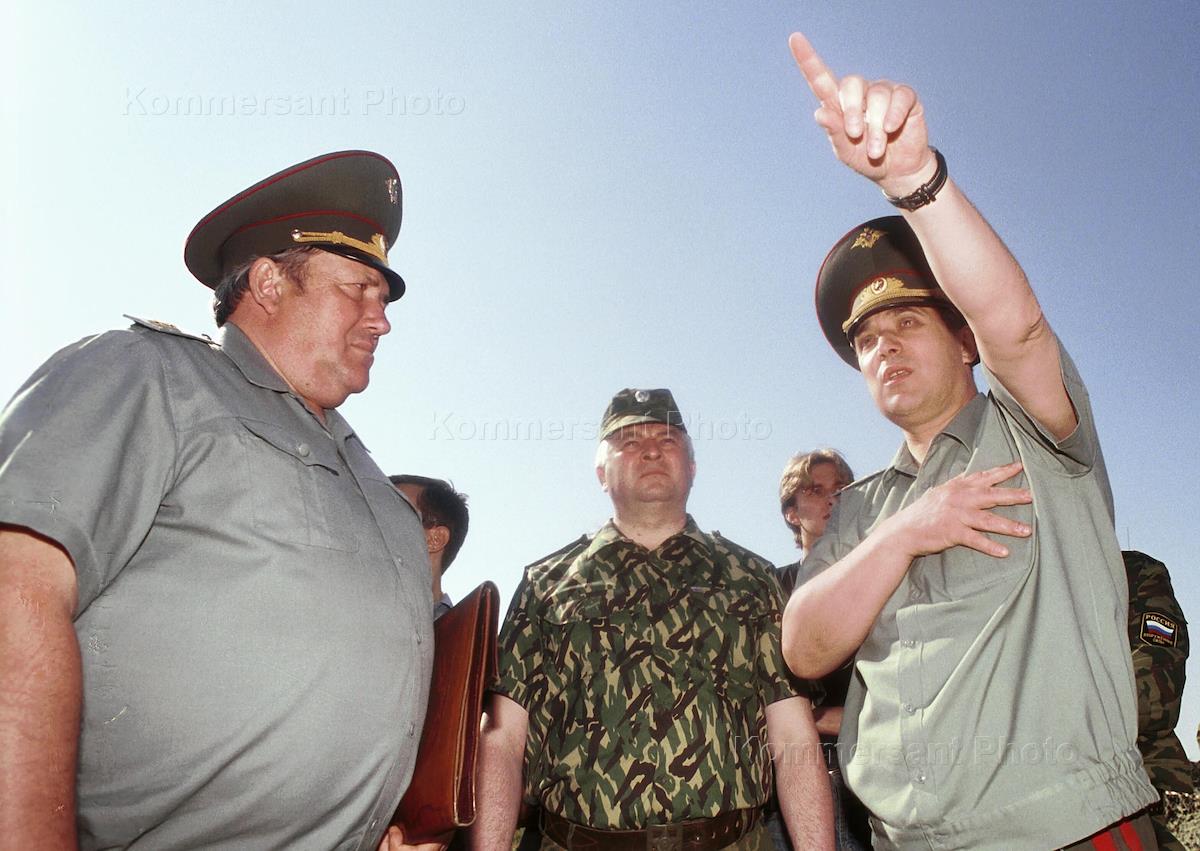 Командующий войсками Ленинградского военного округа Северо-Западного стратегического направления, генерал-полковник Валентин Бобрышев (в центре) и начальник Генерального штаба Вооруженных сил России, генерал армии Анатолий Квашнин (справа) на командно-штабных учениях, проходивших на танковом полигоне Каменка под Санкт-Петербургом.