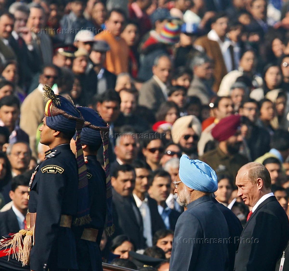 Премьер-министр Индии Манмохан Сингх (второй слева), Президент России Владимир Путин (вторая справа) и президент Индии Абдул Калам (справа) во время военного парада в честь государственного праздника Индии – Дня республики. На торжества по случаю национального праздника Президент России был приглашен в качестве главного гостя.
