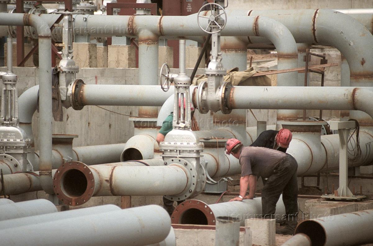 Workers repair pipelines at the oil terminal of the Klaipeda sea-port.