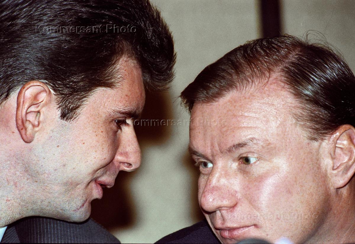 Председатель правления "ОНЭКСИМ" Михаил Прохоров (слева) и президент банка "ОНЭКСИМ" Владимир Потанин (справа) во время пресс-конференции, посвященной отставке Потанина.