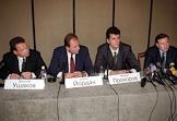 Дмитрий Ушаков (слева), Борис Йордан (второй слева), Председатель правления "ОНЭКСИМ" Михаил Прохоров (второй справа) и президент банка "ОНЭКСИМ" Владимир Потанин (справа) во время пресс-конференции, посвященной отставке Потанина.