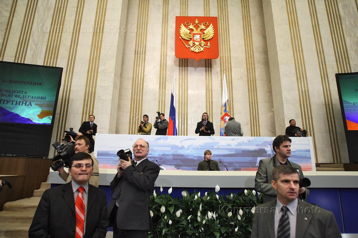 Журналисты на пресс-конференции Президента России Владимира Путина для российских и иностранных журналистов. Пресс-конференция прошла в Круглом зале Кремля.