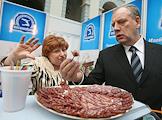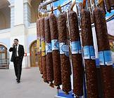 Заместитель министра сельского хозяйства России Сергей Митин (справа) дегустирует сырокопченую колбасу "Борисовского мясокомбината" на церемонии открытия VI — ого Международного форума "Мясная индустрия 2007" и V-ого юбилейного Международного форума "Молочная индустрия 2007". Церемония прошла в "Гостином дворе".